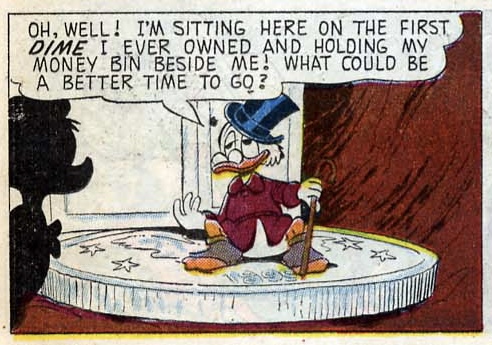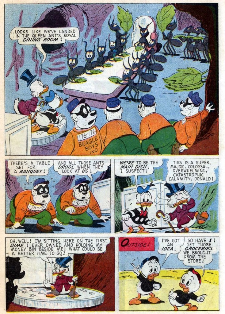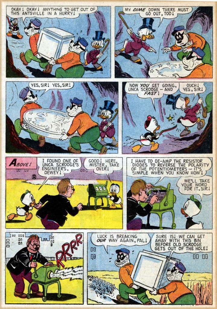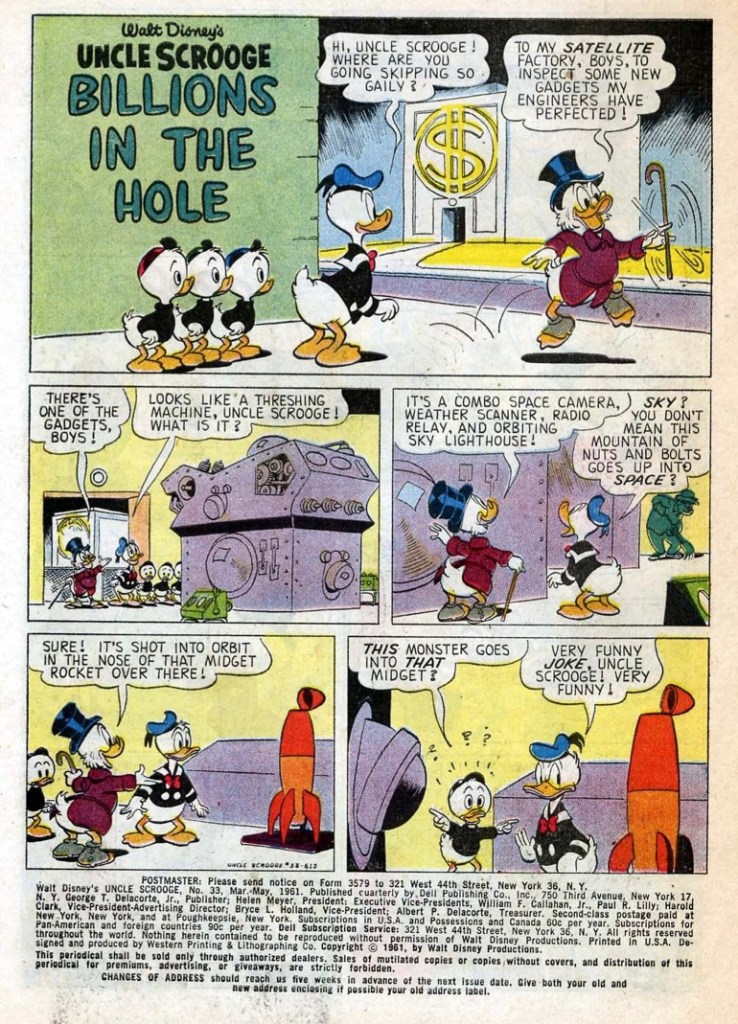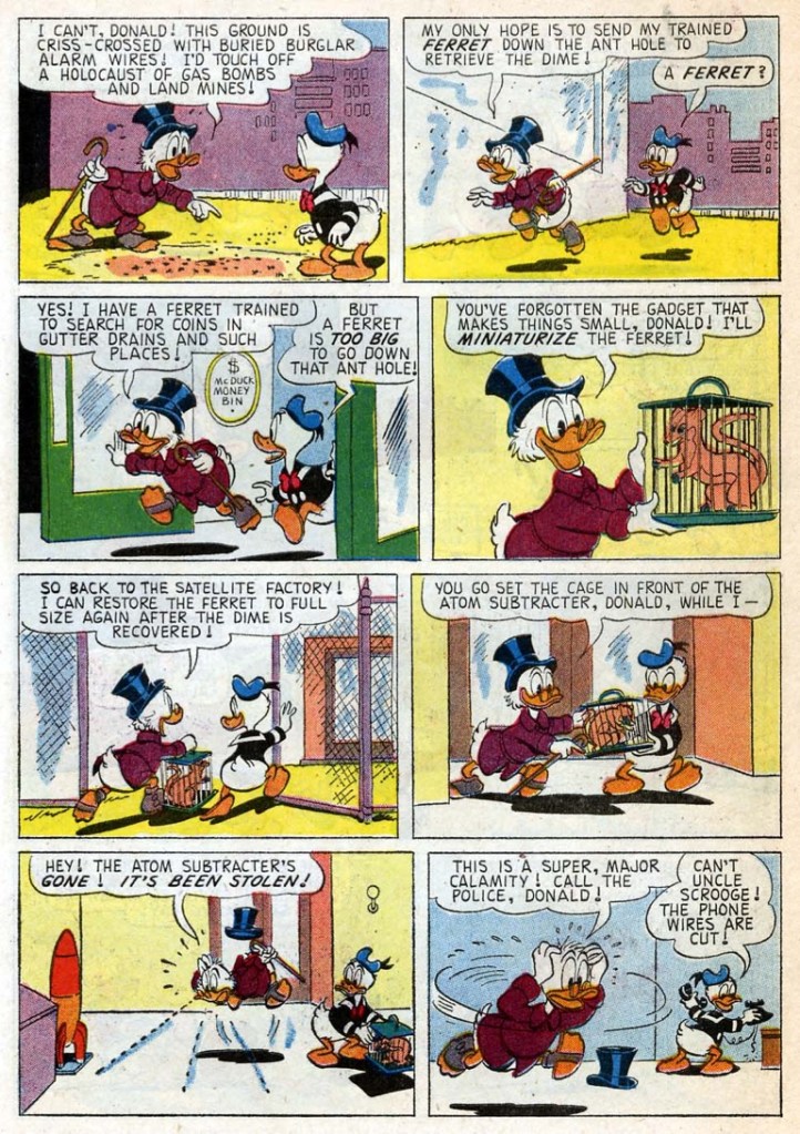 First full Dime story Uncle Scrooge shows Donald and his nephews his atom subtracter able to miniaturize a huge machine to place it in a small rocket, but a Beagle Boy disguised as a janitor nearby overhears the conversation.