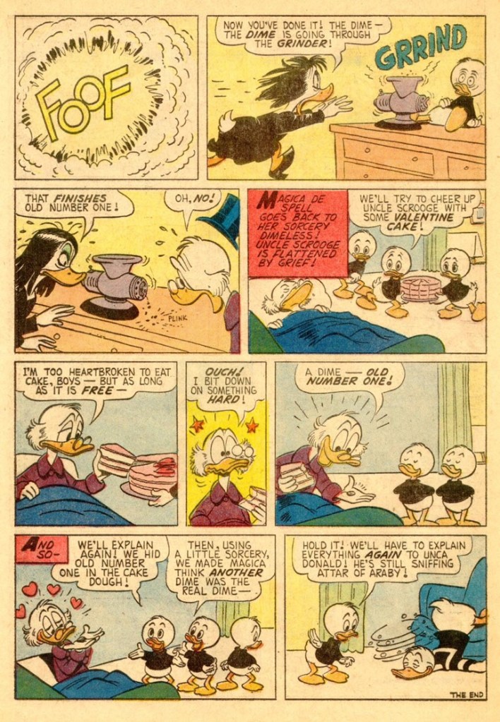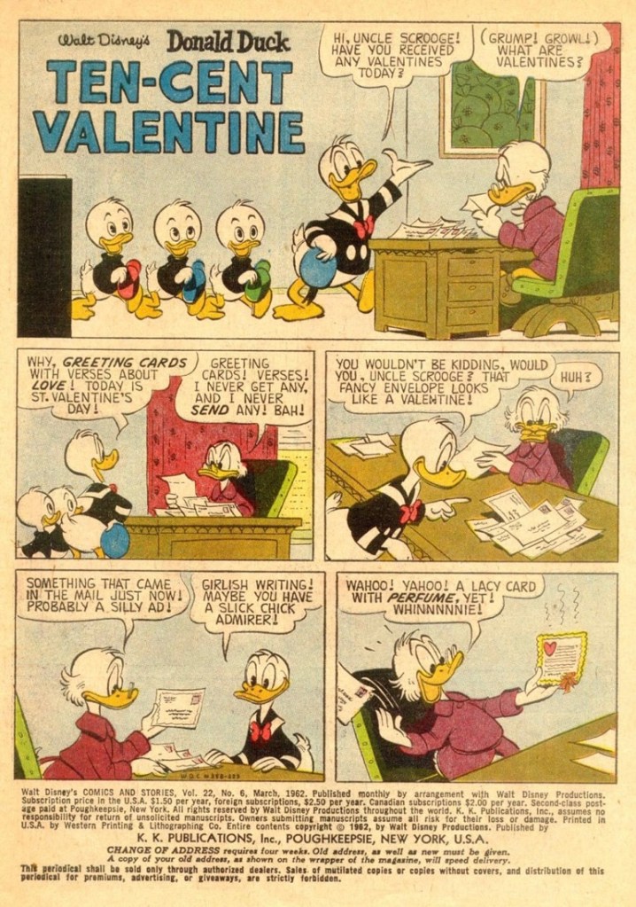 “Ten-Cent Valentine” was first published in the US within the book, Walt Disney’s Comics & Stories 258 in March of 1962. The story was created on June 14, 1961. “Ten-Cent Valentine” is 10 pages long.
