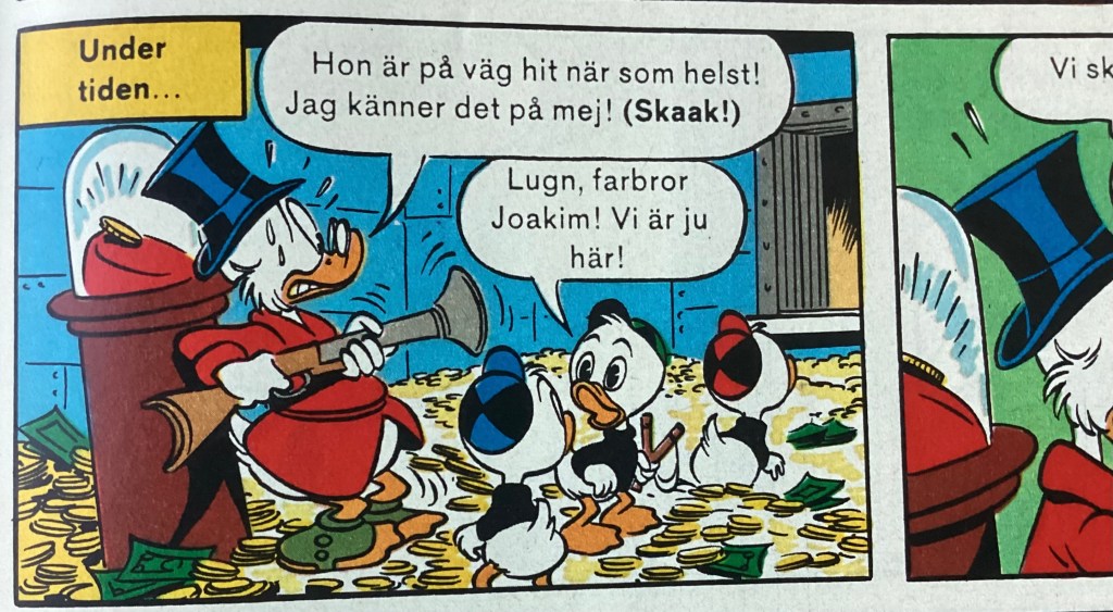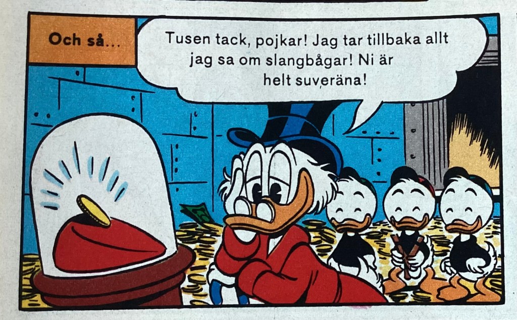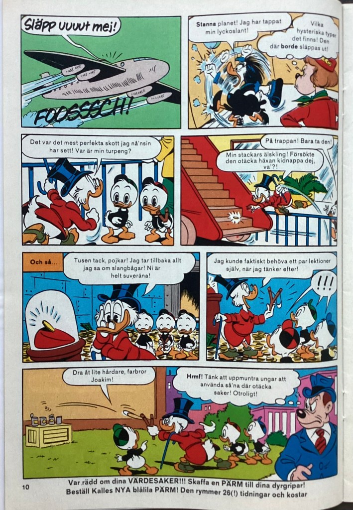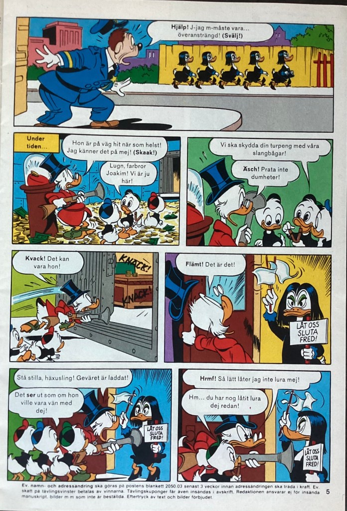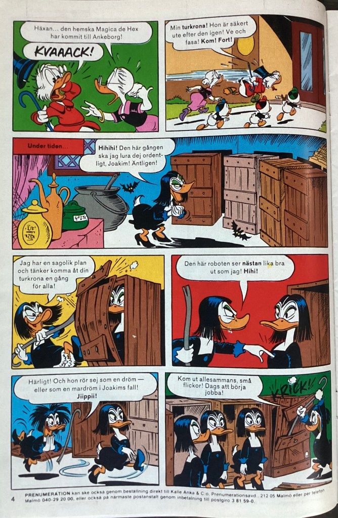 “Bland häxor och robotar” was produced on December 21, 1983 and was originally titled, “Slingshot Protection.” The 8-page story was first published in Kalle Anka & C:o 43 on October 22, 1984. The story was first published in the US in July of 1986 within, Uncle Scrooge 210, where it was titled, “The Robot Raiders of Magica DeSpell.”