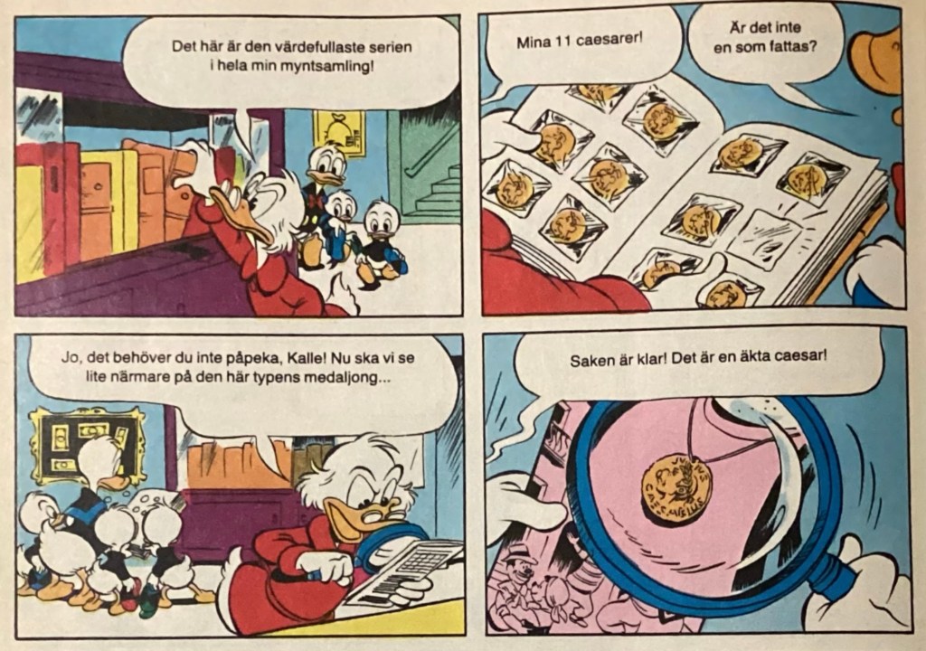 “Den 12.e Caesaren” was produced on March 31, 1982 and was originally titled, “The 12th Caesarius.” It was first published in 3 parts within the Swedish book, Kalle Anka & C:o. Part 1 of “The 12th Caesarius” is 7 pages long and debuted in Kalle Anka & C:o. 50 on December 15, 1982. “The 12th Caesarius“ was first published in the US in September of 1988 within, Uncle Scrooge Adventures 7. The book collected all 3 installments of “Den 12.e Caesaren.”