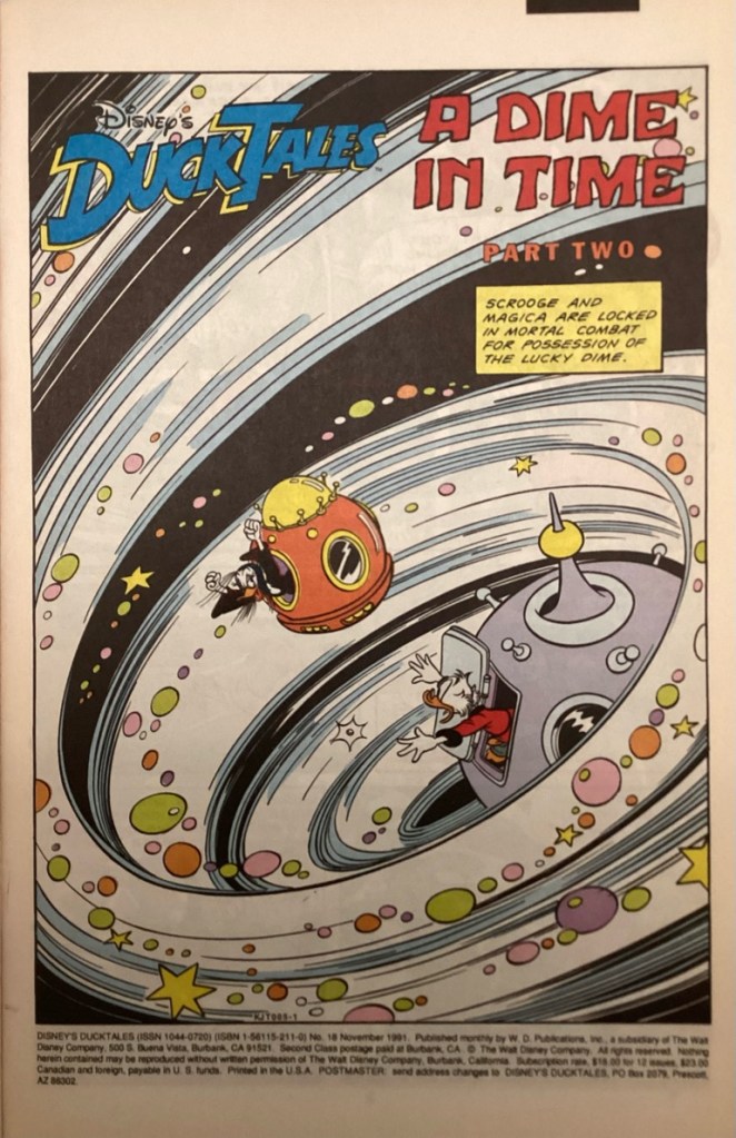 “A Dime in Time” part 2 was first published in the US within the book, DuckTales 18 in November of 1991. “A Dime in Time” part 2 is 23 pages long.