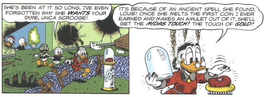 Part 1 of “The Treasury of Croesus” is 8 pages in length and was first published within Andrés Önd #1995-01 (Iceland) & Kalle Anka & C:o #1995-01 (Sweden). Part 2 of the story was first published a week later on January 9, 1995 within Andrés Önd #1995-02 (Iceland) & Kalle Anka & C:o #1995-02 (Sweden). Part 3 of the story was first published a week later on January 16, 1995 within Andrés Önd #1995-03 (Iceland) & Kalle Anka & C:o #1995-03 (Sweden).