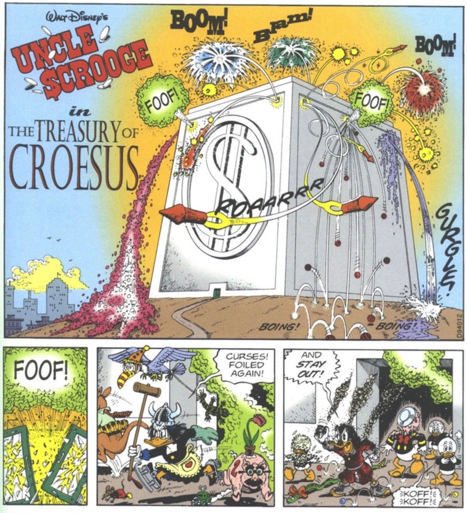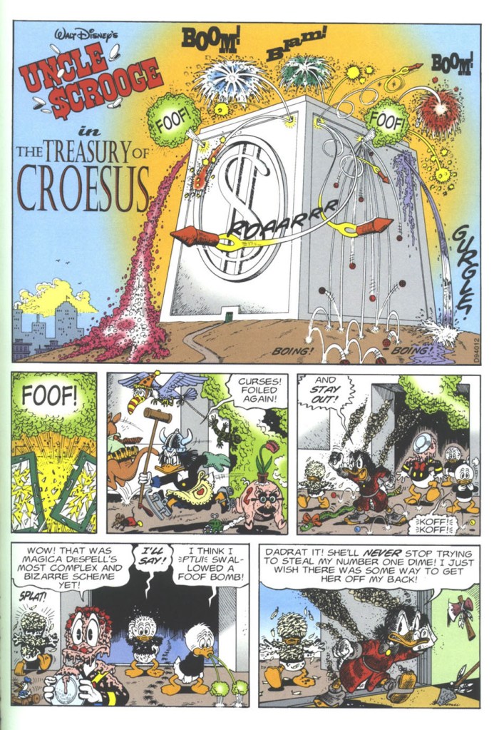 “The Treasury of Croesus” is a 24-page story that was originally produced in Denmark and features Scrooge McDuck’s number 1 Dime. The story was first published in 3 parts during the month of January in 1995 within the Icelandic & Swedish publications, Andrés Önd & Kalle Anka & C:o.