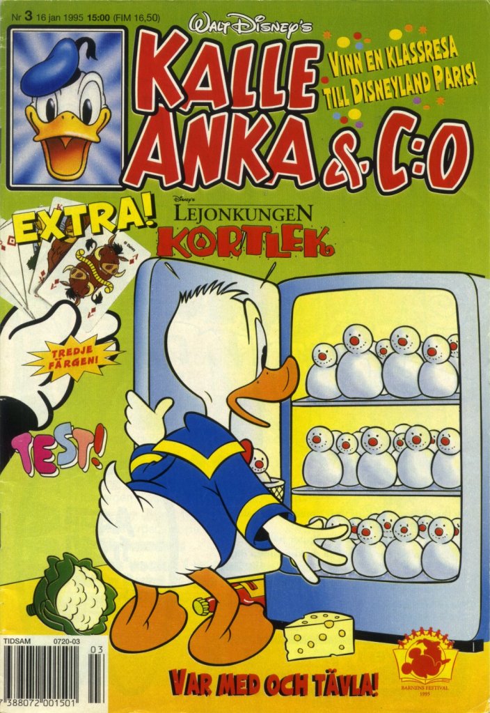 Originally published on January 16, 1995 within Andrés Önd #3 in Iceland & Kalle Anka & C:o #3 in Sweden. The books share a January 16th publication date and are the first comics to publish part 3 of “The Treasury of Croesus.”