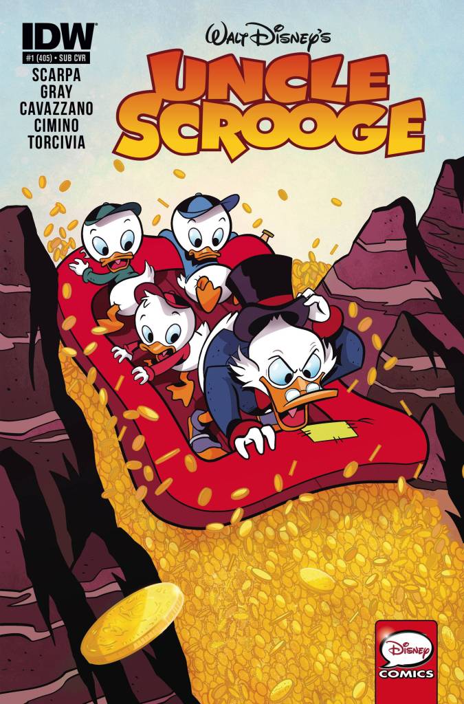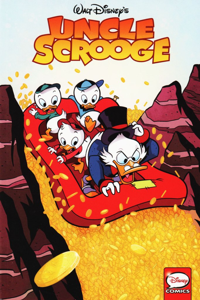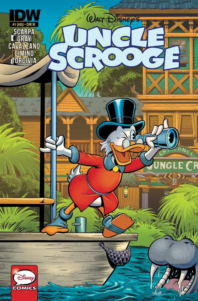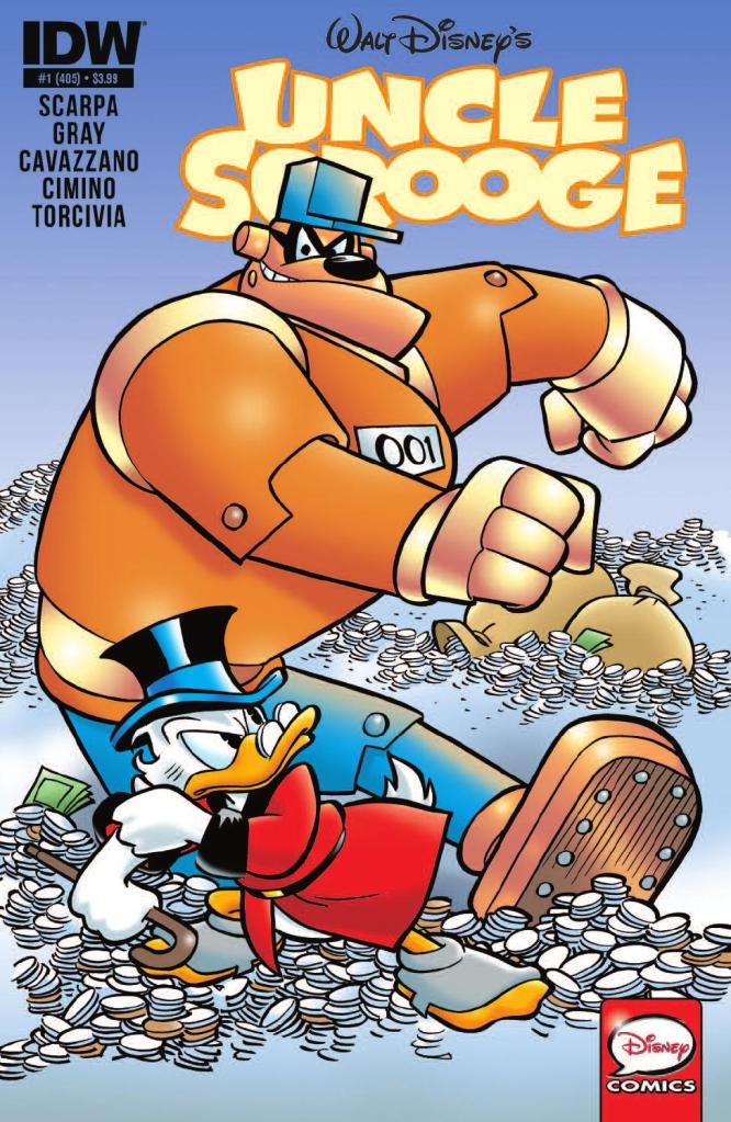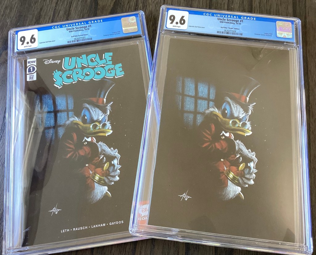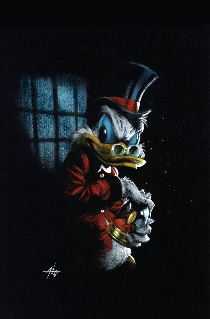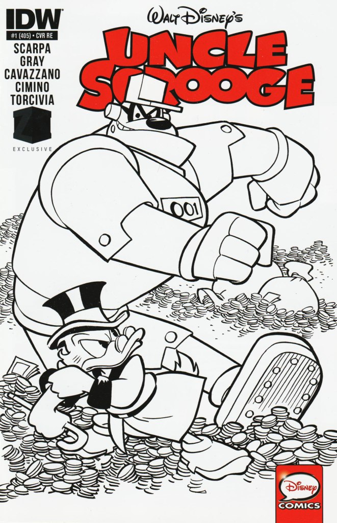 The story was first published in the US within, Uncle Scrooge 405 on April 22, 2015. Issue 405 was released with 7 variant covers. Of the numerous variants, 3 were released in 2021 and they featured the amazing artwork of Gabriele Dell’Otto. His limited edition Scorpion Comics variants feature Scrooge coveting his #1 Dime, seen below. The 3rd black and white variant cover can be found in the image gallery amongst the other US variants.