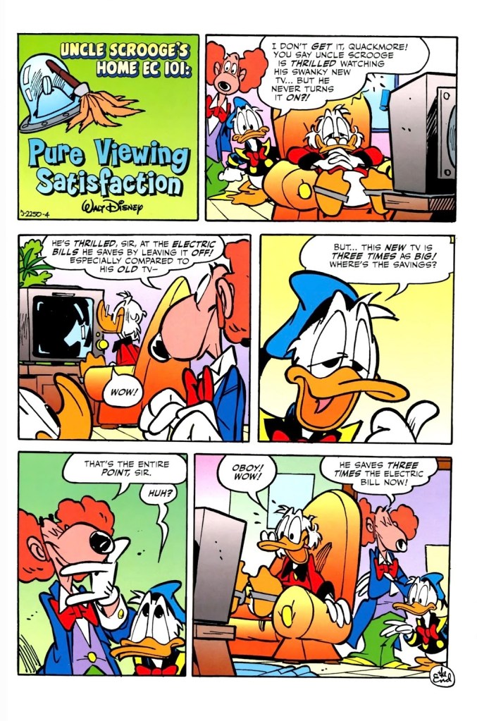 Synopsis: Uncle Scrooge stares happily at his brand new tv even though it isn’t turned on. He ponders the money he’s saving in electricity.