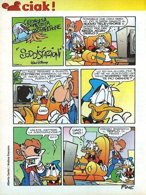 “Pure Viewing Satisfaction” is a 1-page story that was first published in Italy on January 12, 1999 within, Topolino 2250. Uncle Scrooge’s Dime does not play a role in the story but it does appear in the title panel, seen below.