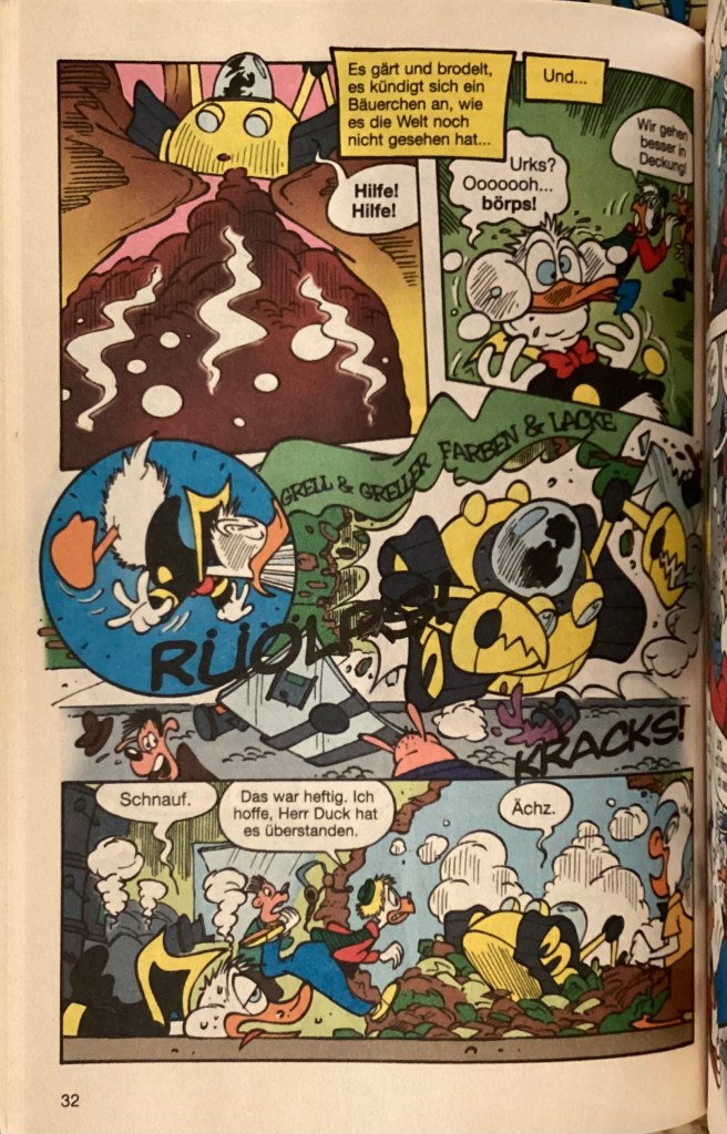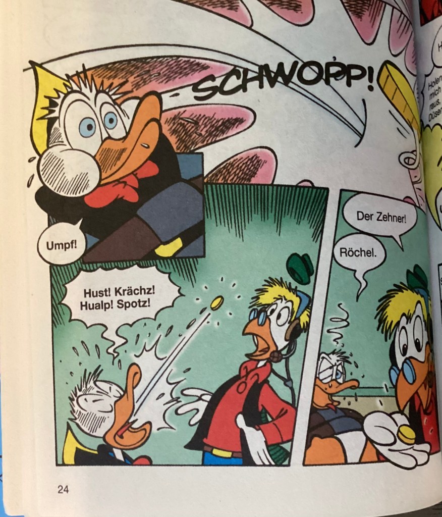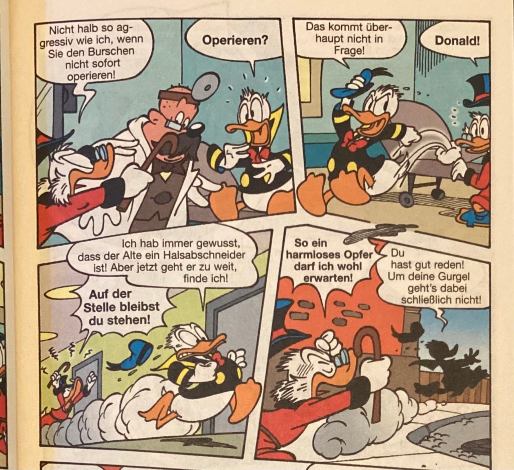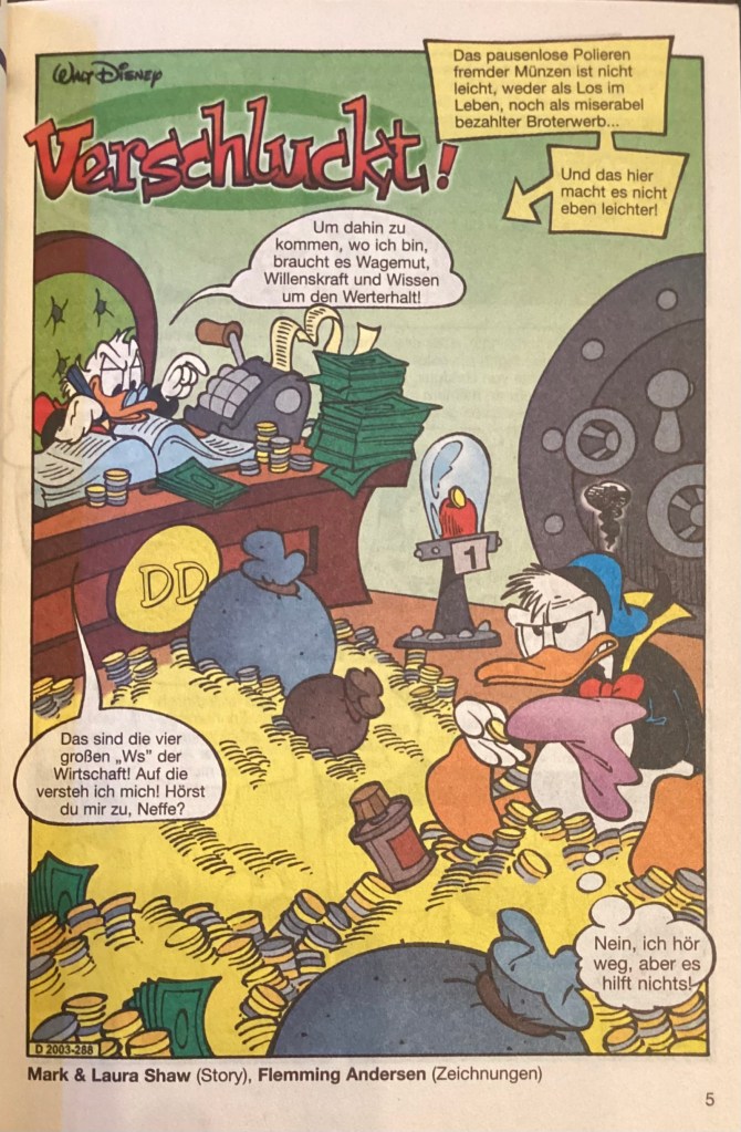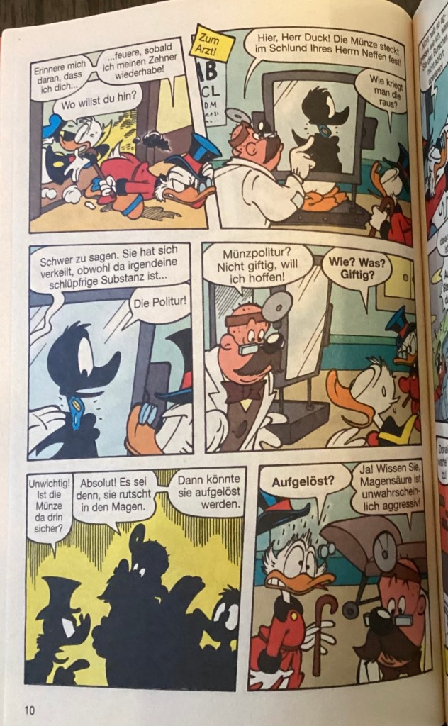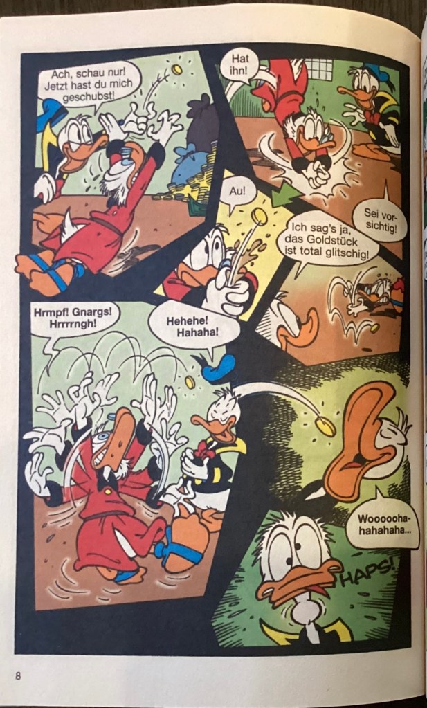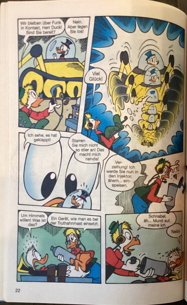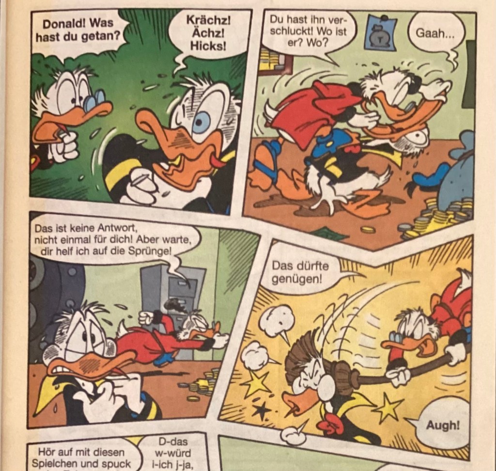 Below are images from the original release of, “Verschluckt!” from Disney 100 Lustiges Taschenbuch 9 (June 2005).